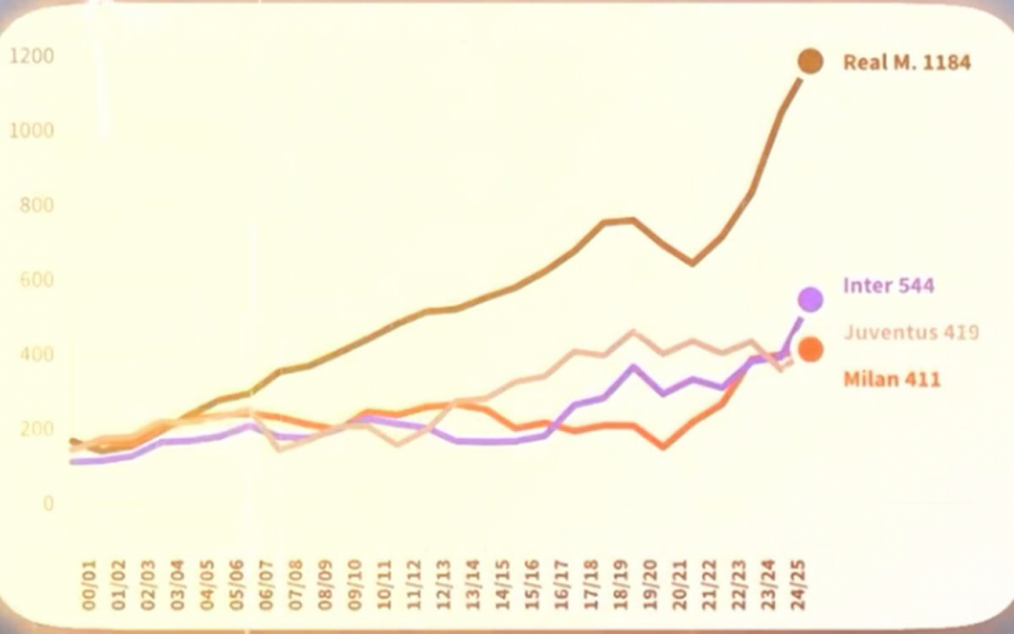 Calcio e Finanza поделилась диаграммой, показывающей динамику доходов мадридского «Реала» по сравнению с «Миланом», «Интером» и «Ювентусом».