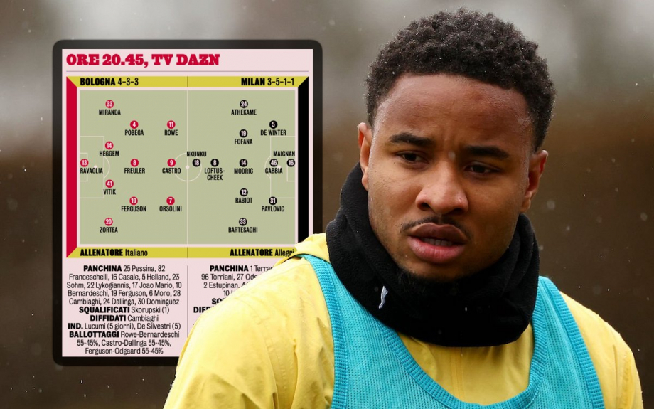 Как сообщает La Gazzetta dello Sport, Аллегри будет использовать пока еще не опробованную пару нападающих - Рубена Лофтуса-Чика и Кристофера Нкунку, причем англичанин будет действовать чуть позади француза. По данным издания, Закари Атекаме также займет позицию правого вингера. Давиде Бартезаги будет левым вингером, а Адриен Рабьо, Лука Модрич и Юссуф Фофана составят тройку полузащитников. В центре обороны сыграют Кони де Винтер, Маттео Габбья и Страхиня Павлович.