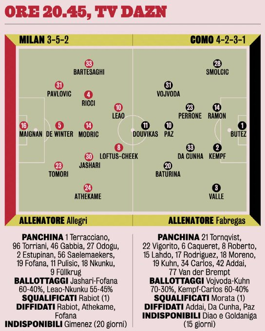 Вероятный состав «Милана» (3-5-2): Меньян; Томори, де Винтер, Павлович; Атекаме, Яшари, Модрич, Риччи, Бертазаги; Лофтус-Чик, Леау.