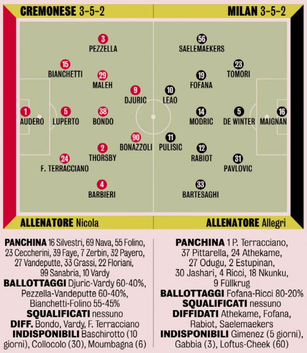 Вероятный состав «Милана» (3-5-2): Меньян; Томори, де Винтер, Павлович; Салемакерс, Фофана, Модрич, Рабьо, Бартезаги; Пулишич, Леау.