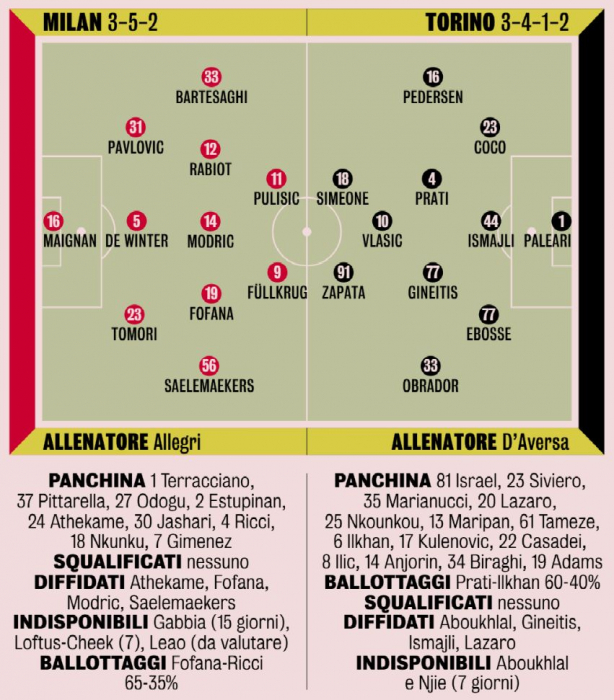 Вероятный состав «Милана» (3-5-2): Меньян; Томори, де Винтер, Павлович; Салемакерс, Фофана, Модрич, Рабьо, Бартезаги; Пулишич, Фюллькруг.