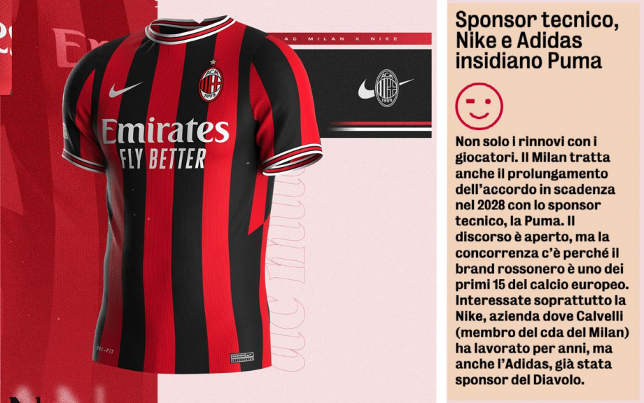 Продажи и креативный подход немецкого бренда вызывают удовлетворение, но Nike и Adidas заинтересованы в том, чтобы стать новыми производителями формы для «россонери». Эти две компании, вероятно, считаются лидерами в производстве футбольной формы.