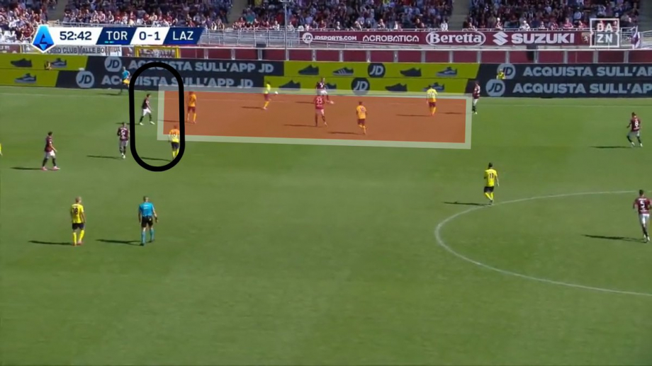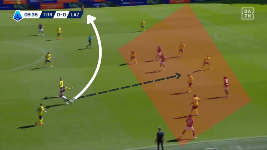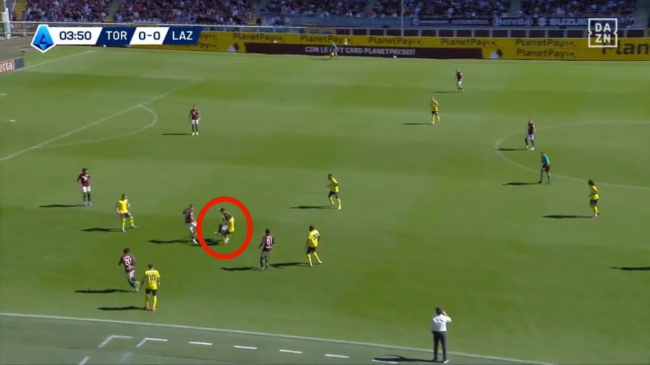 В этой ситуации вы видите, как Риччи отходит в тройку защитников, пока «Лацио» находится в центре блока. Он получает мяч, оценивает свои возможности и видит, что у него есть возможность сделать пас на Войводу (27), но решает перекинуть мяч Лаццаро, чем растягивает компактную оборону «Лацио» и открывает пространство для прохода Тамезе.
