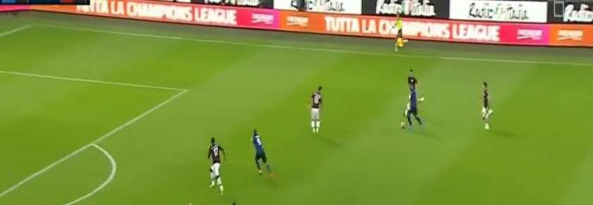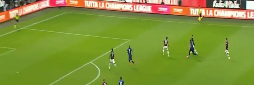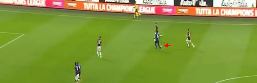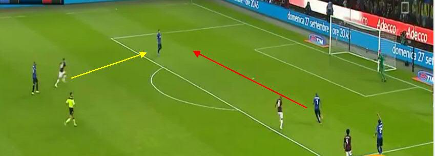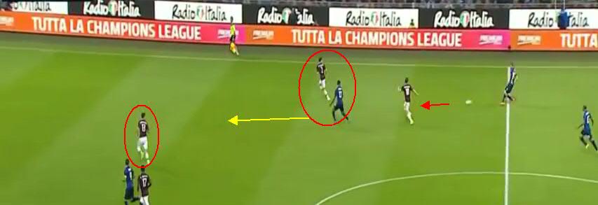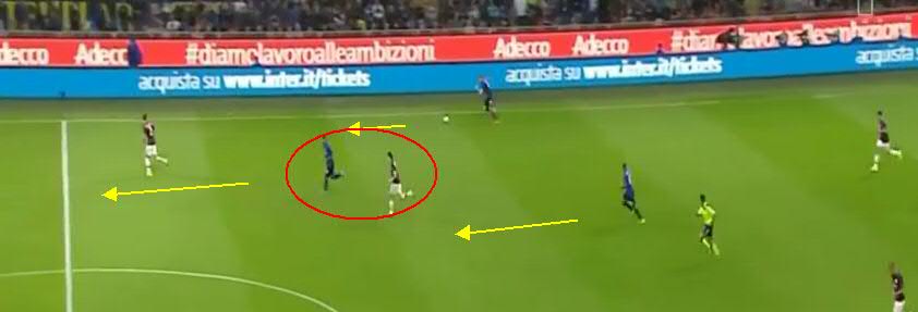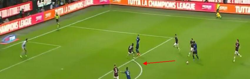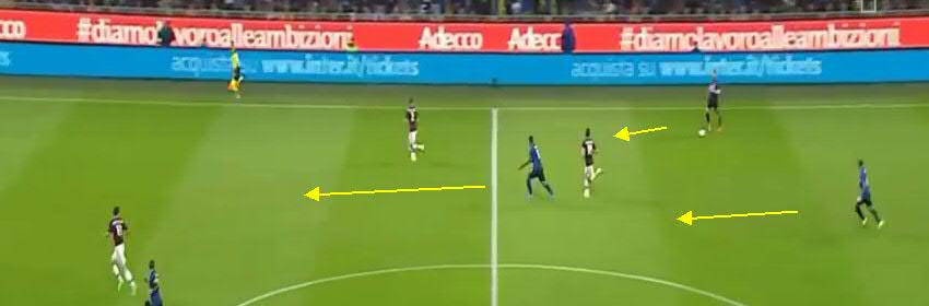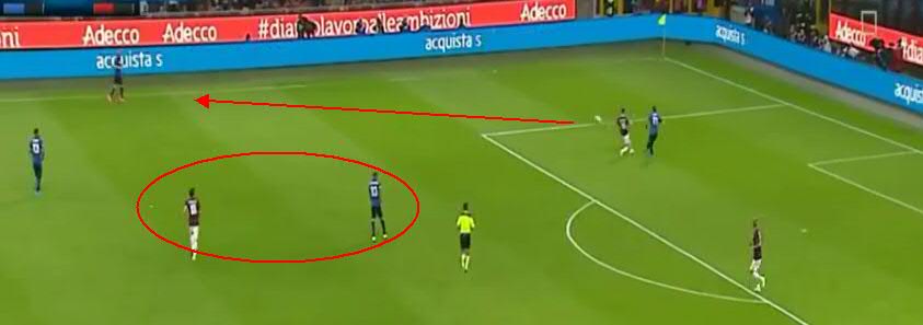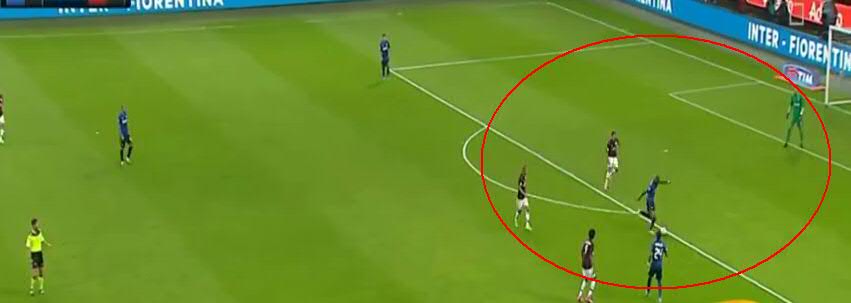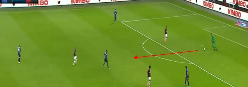Не дав Кондогбии развернуться, игроки «Милана» вынуждают его пасовать назад вратарю. Здесь четко видно, что прямо в штрафной образовалась ситуация «три на три». Но на правом углу штрафной у «Интера» есть свободный игрок.