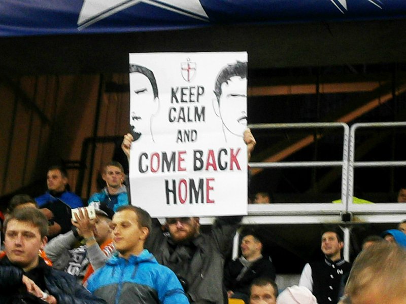 Я знал, что у Олега есть плакат на итальянском, призывающий парочку вернуться в "Милан". Меня накрывает муза и я очень быстро рисую похожий посыл, чуть не опаздывая на матч.