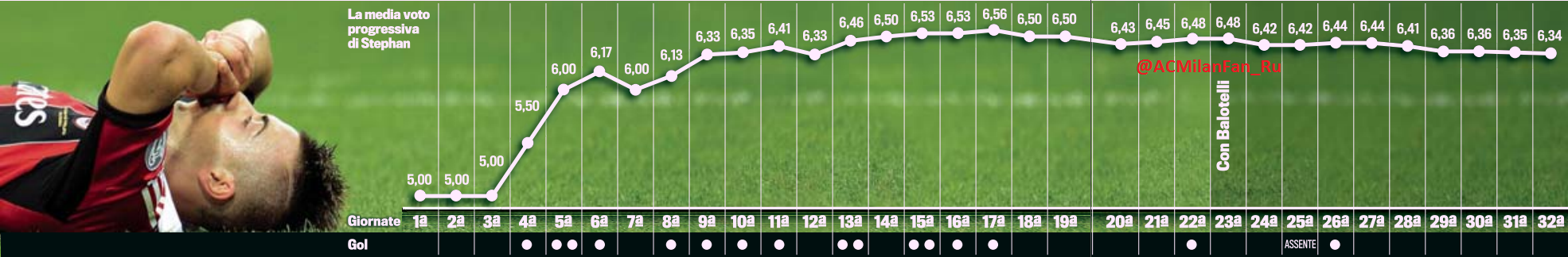 Отдельно отмечен момент прихода Балотелли (23-й тур). Как известно, появление Марио постоянно связывают с ухудшением игры и падением результативности "Фараона". Но как видим, оценки Эль-Шаарави если и понизились, то совсем немного. Стефан по-прежнему приносит пользу команде, пусть она и выражается не в виде забитых мячей.
