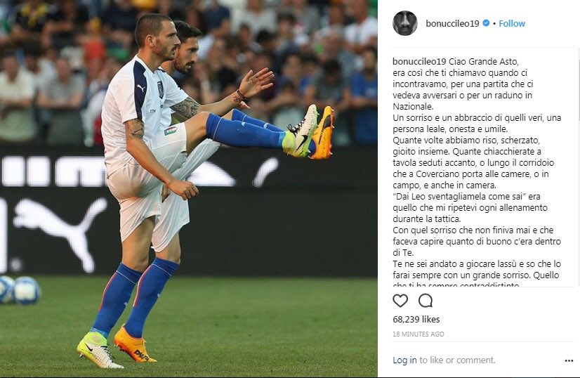 «Чао, Великолепный Асто, - написал капитан «Милана» Леонардо Бонуччи в Instagram. - Так я называл тебя, когда мы встречались как противники и как товарищи в сборной. Тебя отличали искренность, честность и скромность. Как много мы смеялись, шутили и праздновали вместе. Сколько раз беседовали за столом, в коридоре, который ведет в Коверчано, в спальне, на поле или в общем номере. «Пойдем, Лео, сделай стремительный пас, как ты умеешь», - сколько раз ты повторял это во время тренировок. С той улыбкой, которая никогда не заканчивалась. Это давало понять, сколько в тебе доброты. Ты пошел играть в футбол там, и ты сделаешь это с той же улыбкой. Улыбкой, с которой ты был всегда».