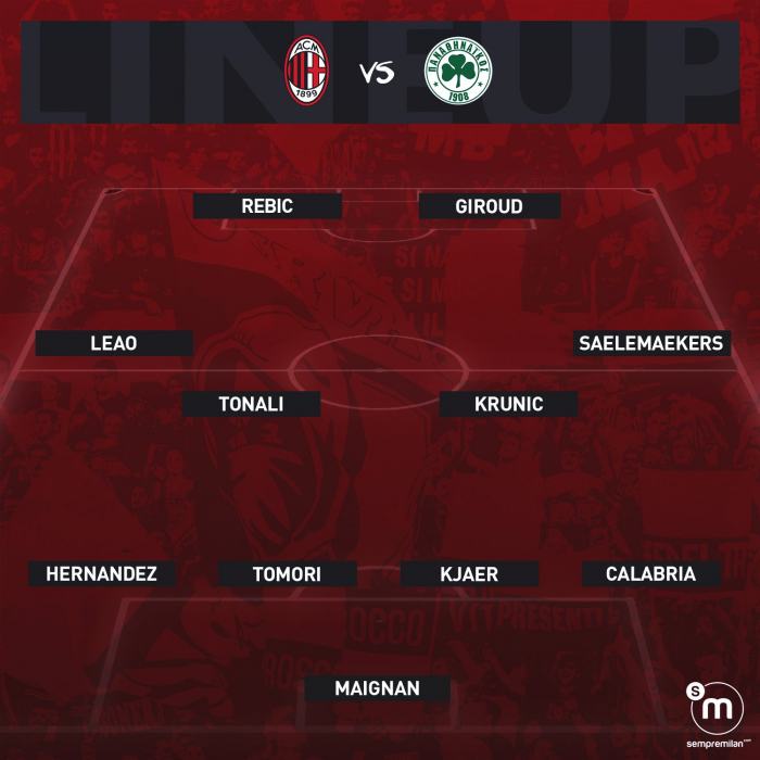 Вместо привычной схемы 4-2-3-1 в поединке с греками главный тренер команды Стефано Пиоли использует 4-4-2. В атаке будут действовать Анте Ребич и Оливье Жиру, а на флангах - Алексис Салемакерс и Рафаэл Леау. Роль капитана будет отведена воспитаннику «красно-черных» Давиде Калабрии.