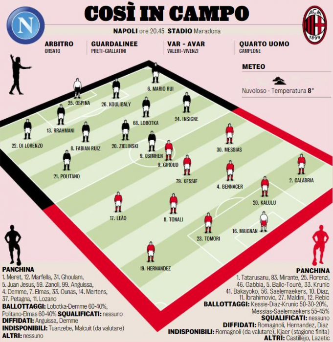 Из-за травмы Алессио Романьоли в паре с Фикайо Томори в центре обороны сыграет Пьер Калулу. Сандро Тонали вернулся после дисквалификации и появится на поле в опорной зоне.