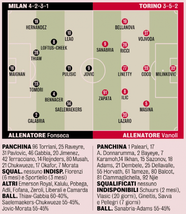 По данным Gazzetta dello Sport, шансы вингеров на выход в старте 55-45 в пользу бельгийца, а Малика Тшау и Маттео Габбьи – 60-40. Лука Йович опережает Альваро Морату (55-45).