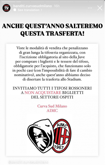 «Учитывая методы продаж, которые сильно ущемляют права организованных болельщиков, мы решили снова отказаться от выезда в Турин. Мы призываем всех болельщиков «россонери» не покупать билеты в гостевой сектор».