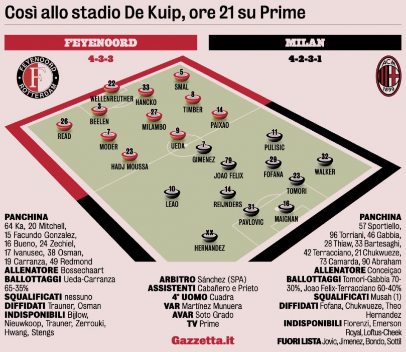 По данным ведущего спортивного издания Италии, Консейсау использует атакующий трезубец Пулишич-Феликс-Леау, который будет поддерживать в нападении Сантьяго Хименеса.