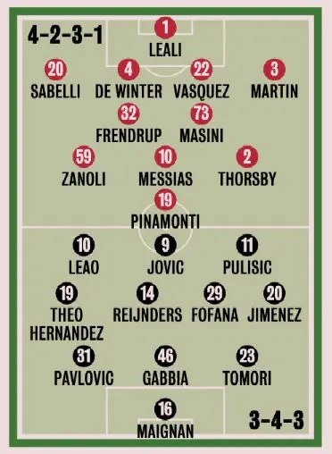 В опорной зоне расположатся Юссуф Фофана и Тиджани Рейндерс. На левом фланге полузащиты будет действовать Тео Эрнандес, на правом - Алекс Хименес. Фикайо Томори, Маттео Габбья и Страхиня Павлович сыграют в обороне.