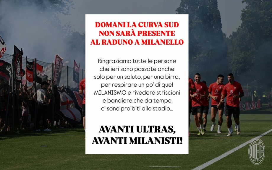 Представители Curva Sud объявили, что не будут присутствовать в Миланелло в понедельник на предсезонном сборе команды.