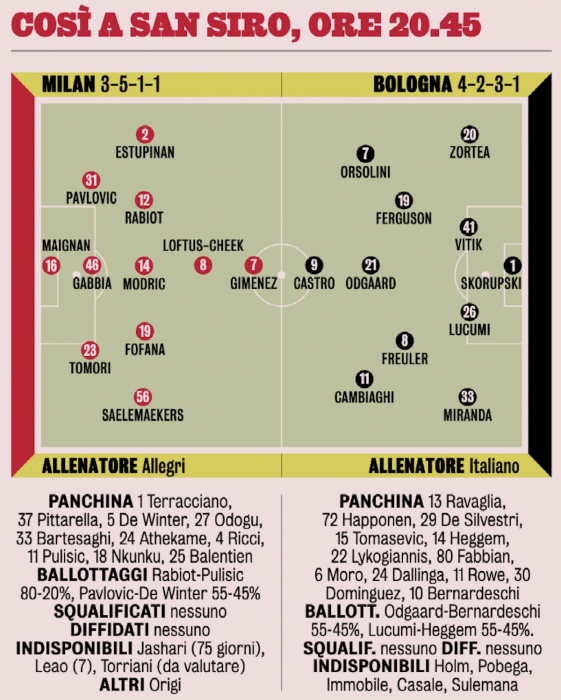 Основные проблемы «россонери» связаны с линией атаки, поскольку Рафаэл Леау еще не оправился от травмы икроножной мышцы, Кристиан Пулишич вернулся из США с мышечной усталостью, а Кристофер Нкунку не в полной мере восстановил свои физические кондиции.