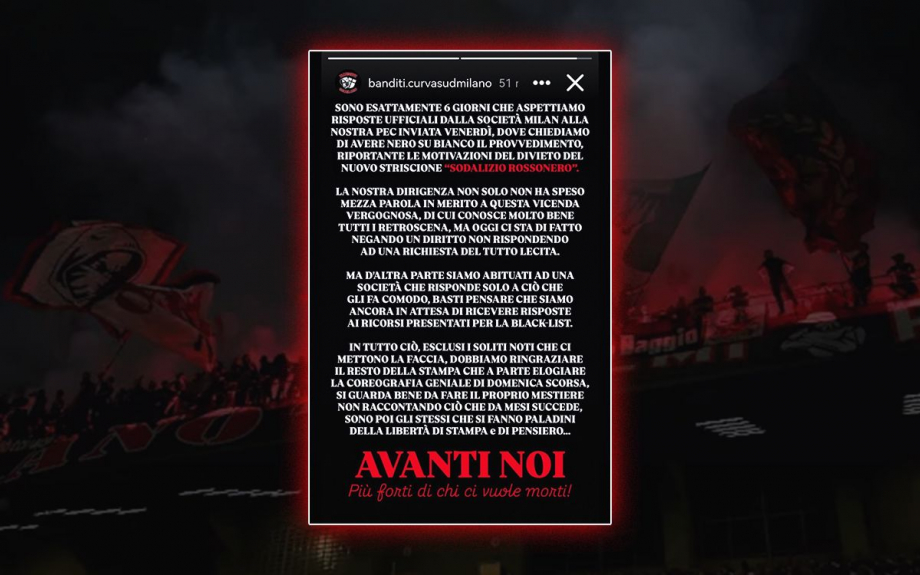 «Мы ждали шесть дней официального ответа от «Милана» на наше заказное электронное письмо, отправленное в пятницу, в котором мы просили черным по белому изложить условия запрета нового баннера: «Sodalizio rossonero».