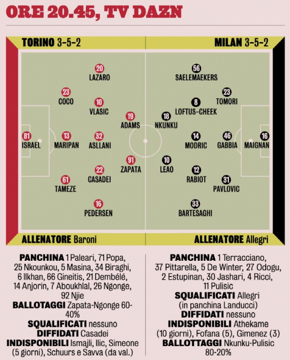 Ориентировочный состав «Милана» по версии GdS (3-5-2): Меньян - Томори, Габбья, Павлович - Салемакерс, Лофтус-Чик, Модрич, Рабьо, Бартезаги - Нкунку, Леау.