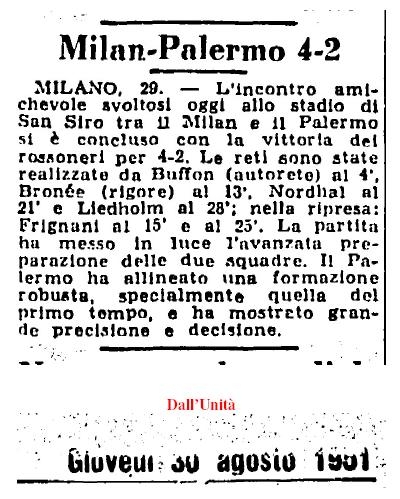 MILAN: Buffon (Bardelli), Silvestri, Grosso, Bonomi (Menegotti), Annovazzi, Tognon (Lavezzari), Burini (Frignani), Gren, Nordahl III, Liedholm, Renosto II - All.: Czeizler. |